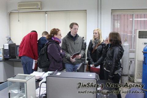 最后,在老师的带领下,德国学生来到了冶金楼一楼,参观了粉末物性测试、热分析、化学分析等实验室。在参观时偶遇的一位来自英国的老师给他们介绍了他正在使用的实验设备的功能与使用方法。