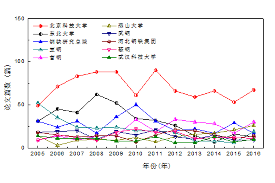 统计,2005―2016年,在钢铁冶金学科国内三大期刊《钢铁》、《炼铁》、《炼钢》上发表的文章,第一作者单位为北京科技大学的文章一直居于国内首位,在2016年达到67篇(见下图)。