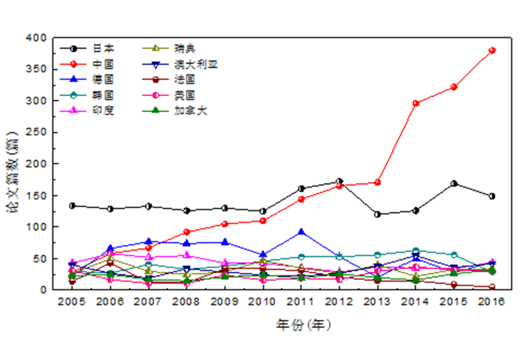 统计,2005―2016年,在钢铁冶金学科国际五大知名期刊《Metallurgical and Materials Transaction B》(美国)、《ISIJ International》(日本)、《Steel Research International》(德国)、《Ironmaking and Steelmaking》(英国)、《Metallurgical Research and Technology》(原名《Revue de Metallurgie》)(法国)上发表的所有文章,第一作者单位为中国的文章已经从2005年的5.8%(一共29篇)升高到2015年的36%(322篇),在2016年更升高到41%(380篇)。从2013年开始第一作者单位为中国的文章高居世界第一(见下图)。
