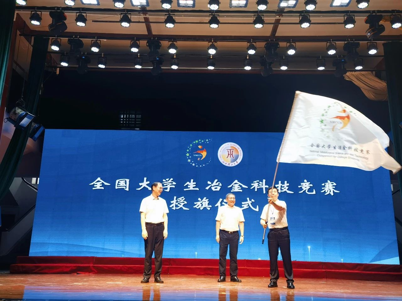 在会旗交接仪式上,江西理工大学副校长廖春发把大赛旗帜转交到中国金属学会秘书长王新江手中,再由王新江授予第八届大赛承办单位北京科技大学,宗燕兵郑重接过了大赛旗帜。