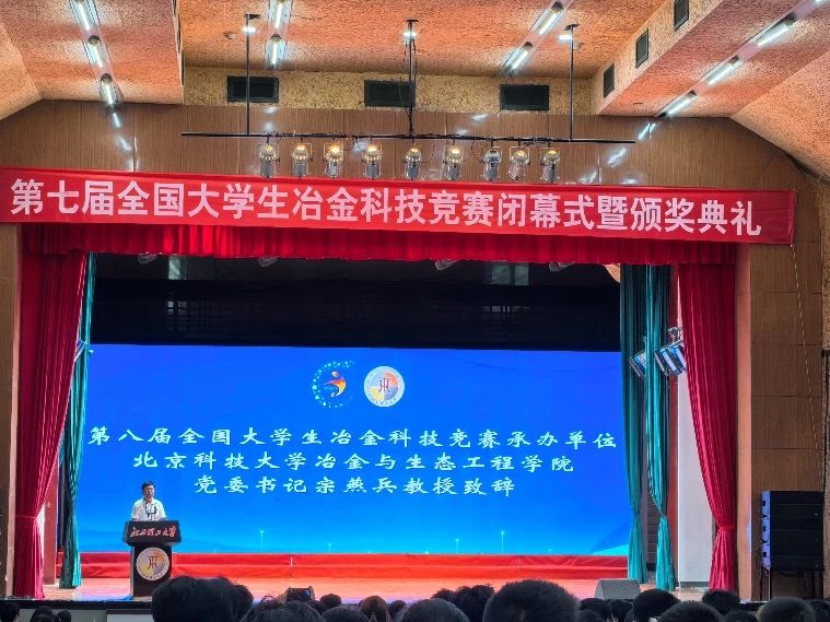 宗燕兵在会旗交接仪式上作表态发言,他对大赛组委会、承办单位江西理工大学的精心组织及评审专家的辛勤工作表达了感谢,并欢迎各兄弟高校2025年到北京科技大学参加第八届赛事。他讲到旗帜是使命、旗帜是担当,北京科技大学接旗意味着接过了赛事承办权,更是接过了大家的信任,接过了发展好事业的沉甸甸的责任。宗燕兵强调,北京科技大学冶金学科将在 “学风严谨、崇尚实践“的优良传统及求实鼎新的校训激励下,继承和发扬好以往各届竞赛的宝贵经验,以更加开放的姿态,更加严谨的态度,更加奉献的精神,积极筹赛,用心用情用力全力为赛,扎实做好作品的广泛征集、赛事的精心组织,扩大影响力,提升获益面,挖掘创新点,力争把新一届赛事办成公平公正、规范有序、创新服务、团结向上的竞赛平台,力争把新一届赛事办成青年学子碰撞智慧、展示才华、实现梦想的标志性赛事,力争把新一届赛事办成促进冶金学科发展和冶金学子提升的促学、促教、促创的高质盛会!
