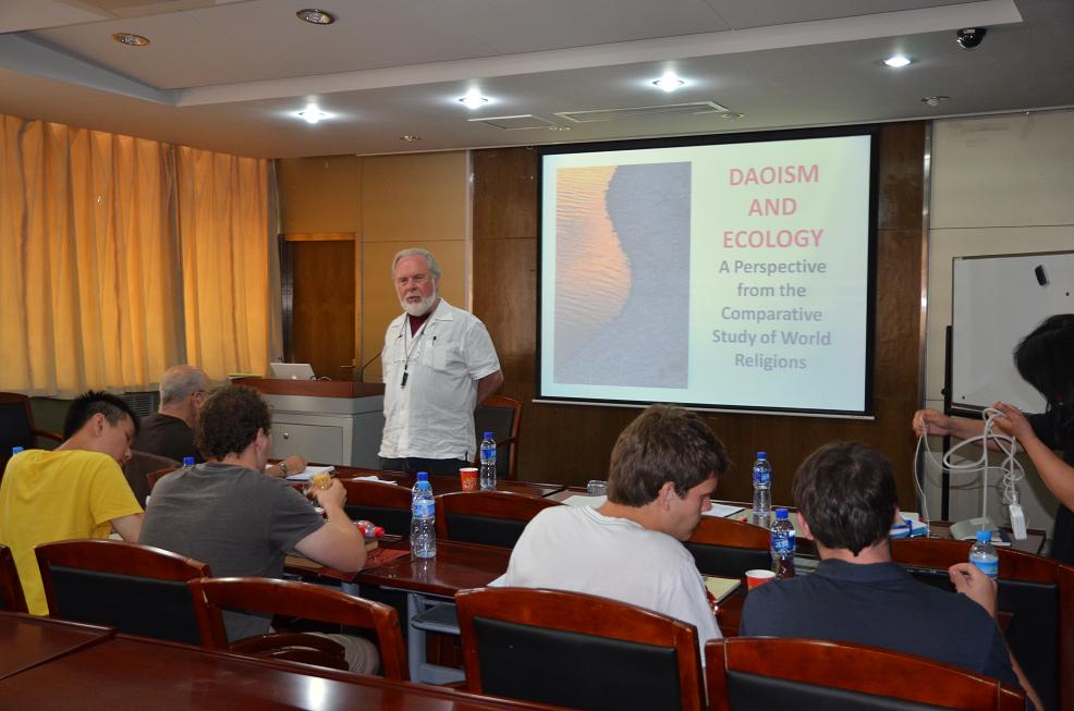 Norman Girardot教授做了题为《从宗教比较史学看道教和生态的关系》的讲座。讲座比较了西方宗教和道教在起源、教义和发展历程上的不同,指出道教是更加自然、生态、和谐的宗教。讲座还从“混沌”、“气”、“五行”等学说中分析了中国人与众不同的思维模式的原因,并认为21世纪的宗教正逐步被人们所重视而回归到其应有的地位。