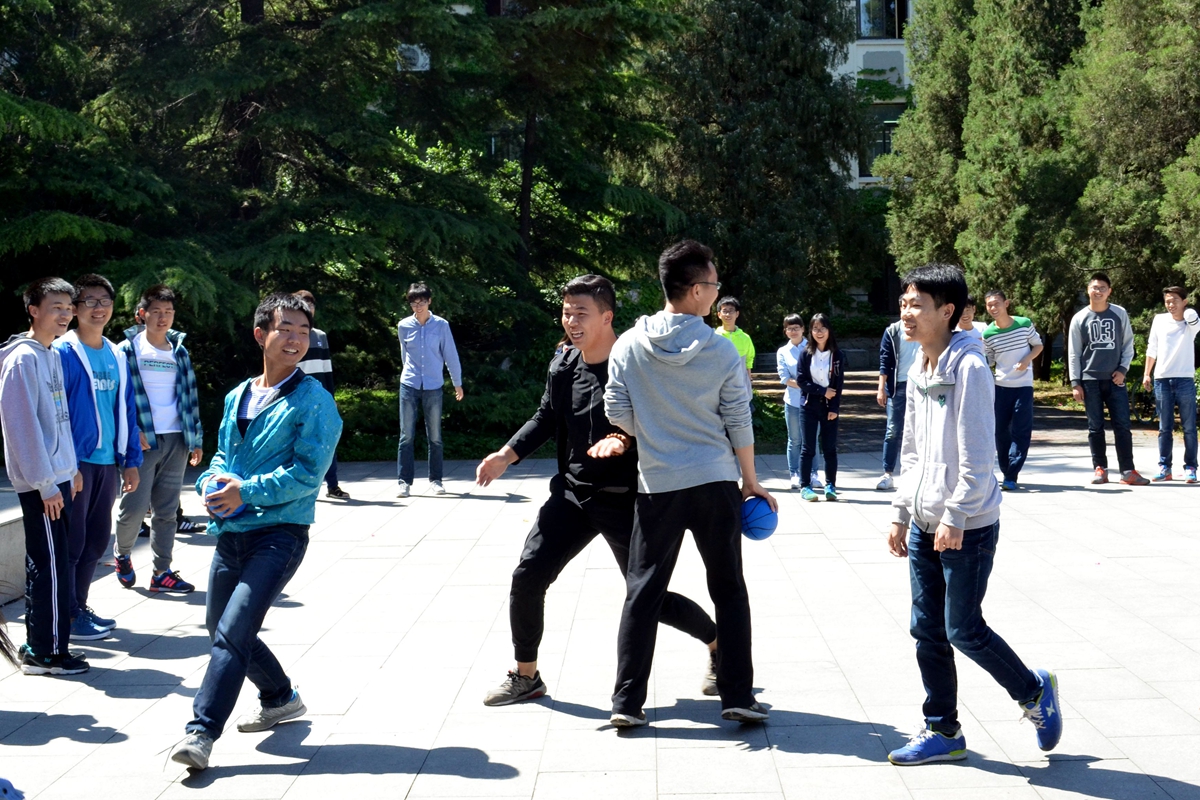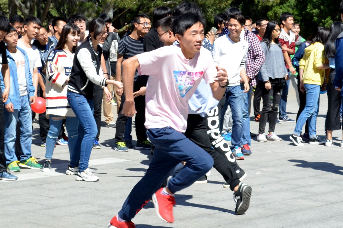 最后一个游戏则是抛球,所有参与活动的同学围成一个大圈,一直在旁观看的辅导员也应同学们要求亲自上阵作为“猴”参与球的拼抢,将本已非常活跃的气氛更加推向了高潮。“猴”们相互合作,左突右挡,不断有球被截下,同学们的欢呼声也此起彼伏。