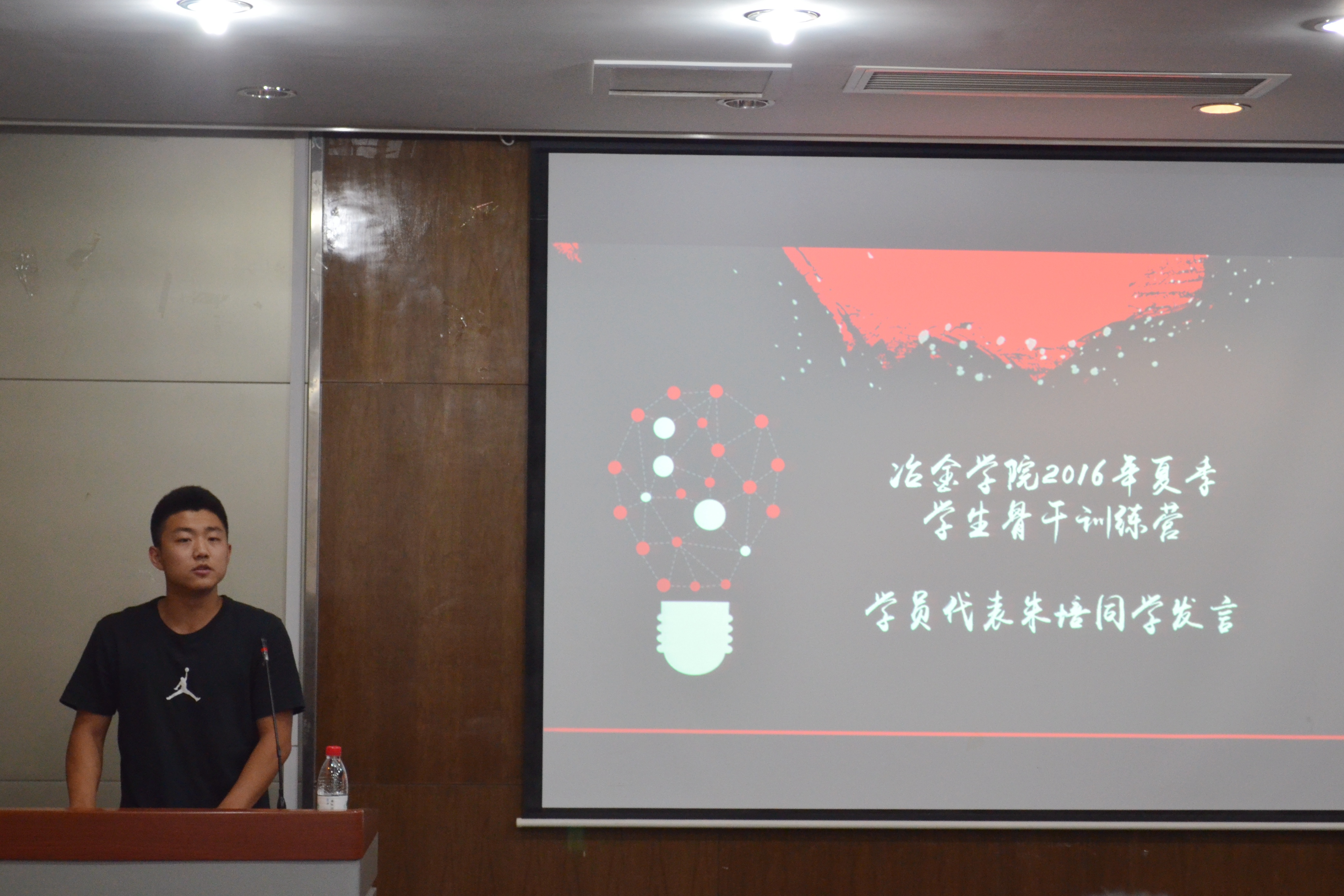 2016年夏季学生骨干训练营须知及分班情况。接下来,学员代表朱培同学代表全体学员进行发言。