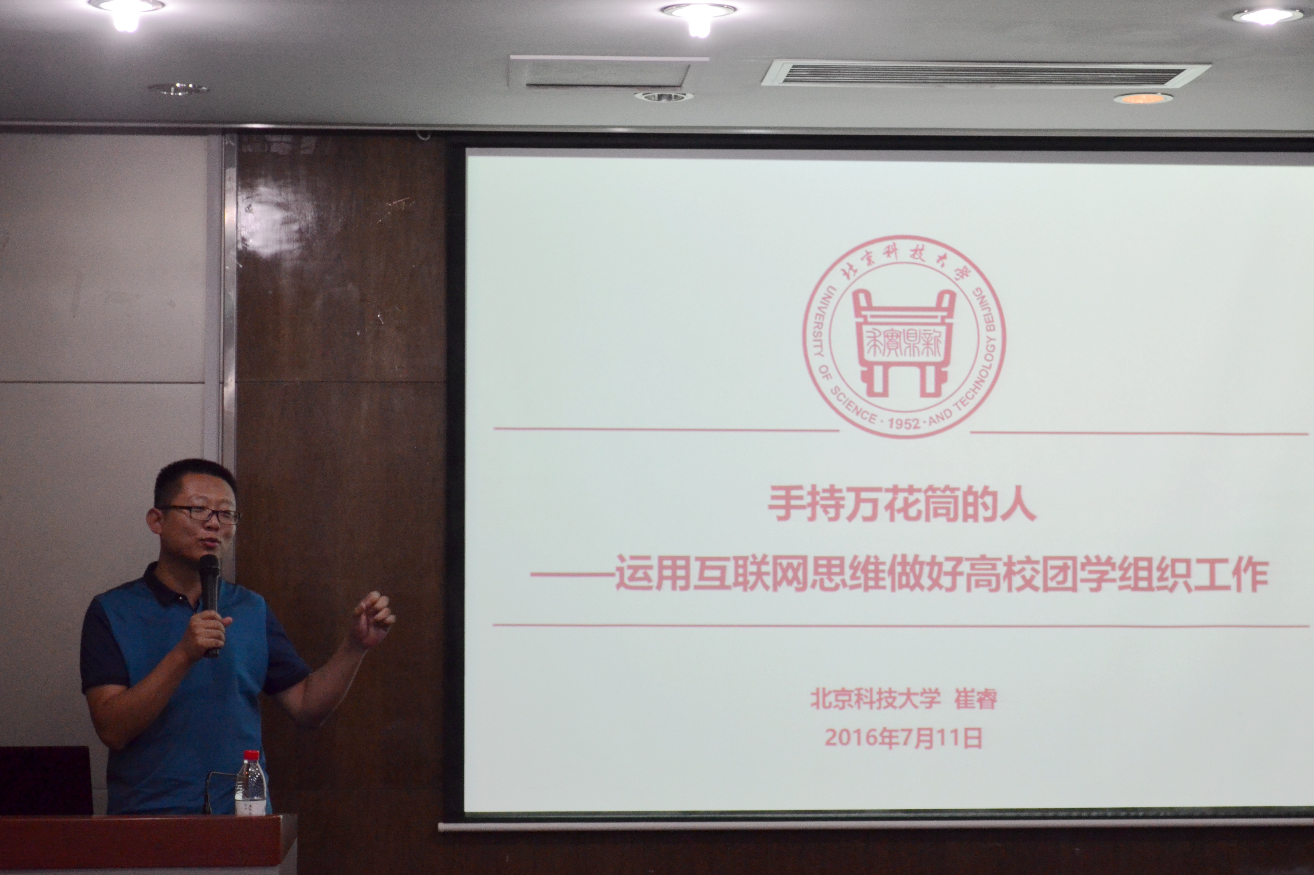 随后,校团委书记助理崔睿老师为训练营全体学员带来《手持万花筒的人―运用互联网思维做好高校团学工作》专题讲座。崔睿老师首先提出“最好的宣传往往不像宣传”这一论点。他先从京东的互联网思维式宣传营销手段引例,用通熟易懂的语言给我们简要介绍了互联网思维。