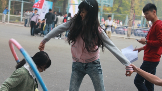 在班级集体游戏部分,新生同学们以班级为单位依次进行了“吐泡泡”、“换位”、“动感呼啦圈”、“诺亚方舟”和“趣味接力”等五个团队熔炼小游戏。活动现场气氛异常热烈,同学们摩拳擦掌、跃跃欲试。七个班级七支队伍,在场地上进行了集体智慧与团队协作的较量。“吐泡泡”、“换位”考验了新生同学们的反应与速度,“动感呼啦圈”增加了新生同学们彼此的默契程度。立体化的造型、零距离的接触,“诺亚方舟”游戏中全班齐上阵,帅气的“钢小伙”托起可爱的“铁姑娘”,力求使地面上单薄的报纸承载更多的同窗伙伴。担任活动裁判的学院团委学生会2014级学生骨干们公平执规、详细记录并为新生同学们做好安全提示和活动保障工作,发挥了学长学姐们的服务与表率作用。