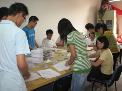 团委学生会的部长们忙碌着布置迎新现场