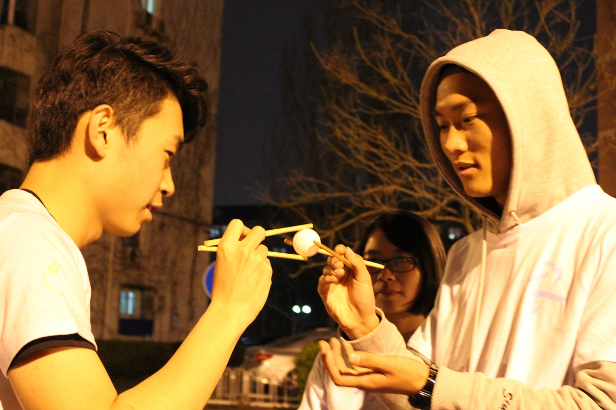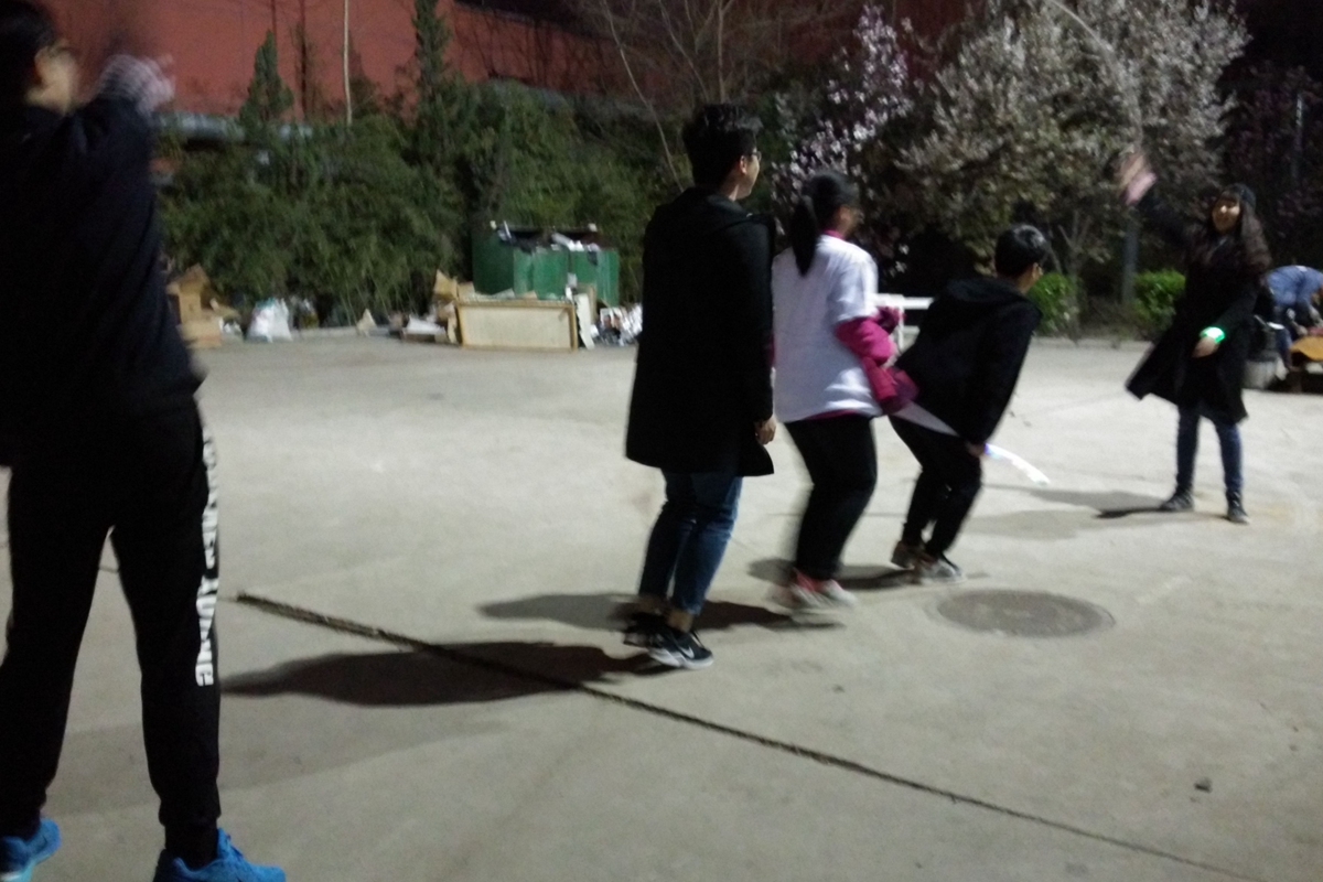 1号站点设置在五环广场,学生会主席邓雨平和德州游戏主任赵子晗同学担任裁判。参赛选手需要找本队人数的二分之一位路人分组踢毽子,每组至少两名队员,一位路人,连续完成十个即可过关。这项游戏考察了参赛人员身体协调能力和组员默契程度,有利于团学内部建设。2号站点在八九斋东侧花园,裁判是王甜雨和吕彬玉同学。参赛者在回答了“西门的毛主席像伸的是哪只手”这个问题后才可进入游戏环节。游戏是参赛者相互传递乒乓球并且保持球不掉落,有些成员夹着的乒乓球自由落体而有些成员则夹着乒乓球健步如飞。