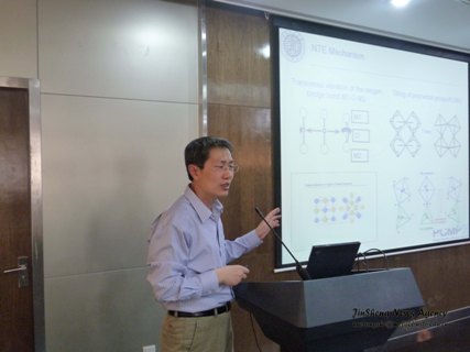 首先,邢献然教授以故事的形式,围绕《负热膨胀氧化物和功能材料的热膨胀调控》这一主题,深入浅出地介绍了负热膨胀及负热膨胀材料,并详细列举了这一反常材料的广阔运用前景。随后,他又对负热膨胀材料的发展史及其衍生出的种类、负热膨胀效应的解释和零膨胀铁性材料的设计等问题逐一讲解,并重点介绍了我校在钛酸铅基化合物 的负热膨胀性质研究方面的突出成就,以及其在国内外造成的巨大影响。