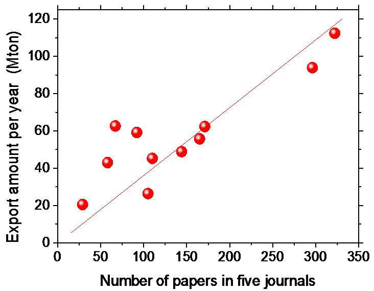 图3 中国在国际五大冶金期刊上(MMTB、ISIJ、Steel Research International、Ironmaking & Steelmaking、Metallurgical Research and Technology)发表的文章和中国钢铁出口量的关系