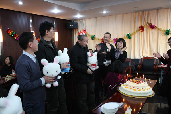 联欢会在欢快喜庆的气氛中拉开帷幕。2011年是兔年,活动伊始,学院工会特地为属兔的教师们准备了精美的礼品,订制了美味的生日蛋糕,在”祝你生日快乐”的乐曲中,属兔的老师们许下心愿,吹灭蜡烛,与在场的所有老师们分享了生日大蛋糕。属兔的老师们还轮番上台,为大家抽出幸运奖品,送出祝福。据悉,我院一共有22位属兔的老师,分别为60岁、48岁、36岁、24岁,四代同堂,彰显学院的底蕴与生机。