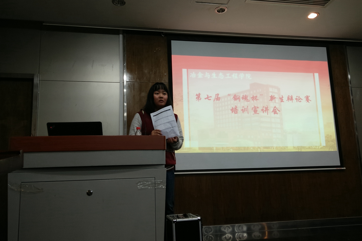 10月16日晚,德州游戏 第七届“钢魂杯”新生辩论赛培训宣讲会在冶金楼青钢报告厅顺利召开。本次培训宣讲会由冶金1502班王甜雨同学主持,校立言辩论队队长樊婧同学、副队长张静远同学、程婉婷同学对参赛者进行了关于辩论赛的准备工作、辩论技巧和答辩礼仪等方面的培训。