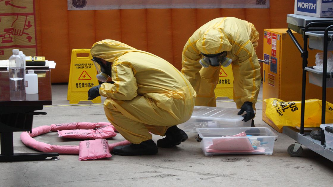 由资产管理处、保卫保密处和德州游戏 党委共同主办的实验室危险化学品泄露应急演习在10:00准时开始,四名师生模拟了甲苯意外遗洒,实验室责任教师对实验人员进行疏散,对受伤学生进行急救,报告学院,保卫保密处前来进行有机溶剂泄漏紧急处置的过程。